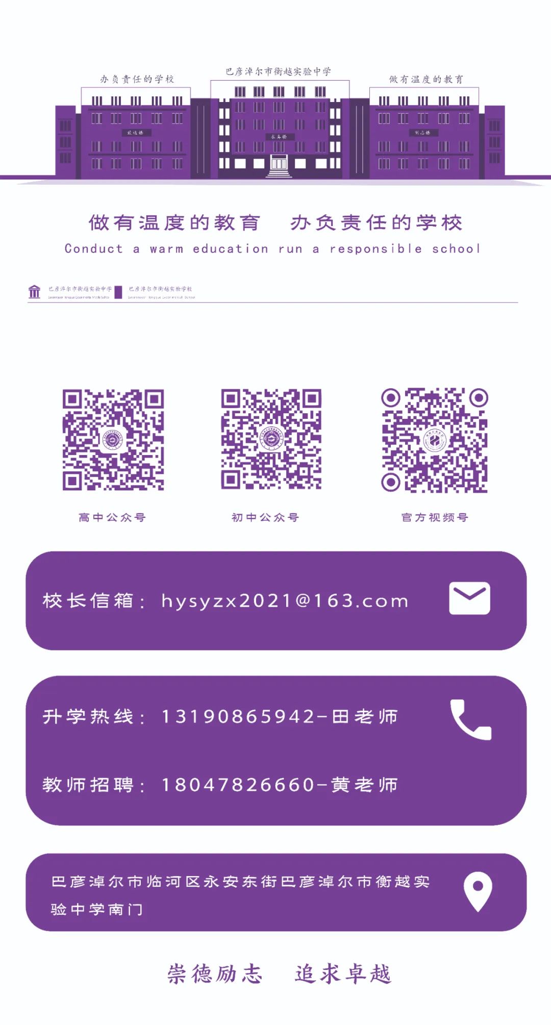 衡越教育集团致力于支持基础教育改革与发展,凝聚优秀人才,整合北京、衡水等全国名校优质教育资源。通过与各地政府合作办学,我们为学生提供公平且高质量的教育,全面满足人民群众对教育的需求。2022年,巴彦淖尔市衡越实验学校小学部正式成立。我们秉承“以学生为中心,用爱点亮满天星”的集团办学理念,让每一位孩子都拥有明亮的眼睛、灿烂的笑容、温暖的爱心、坚定的信念、责任感、勇气和力量。