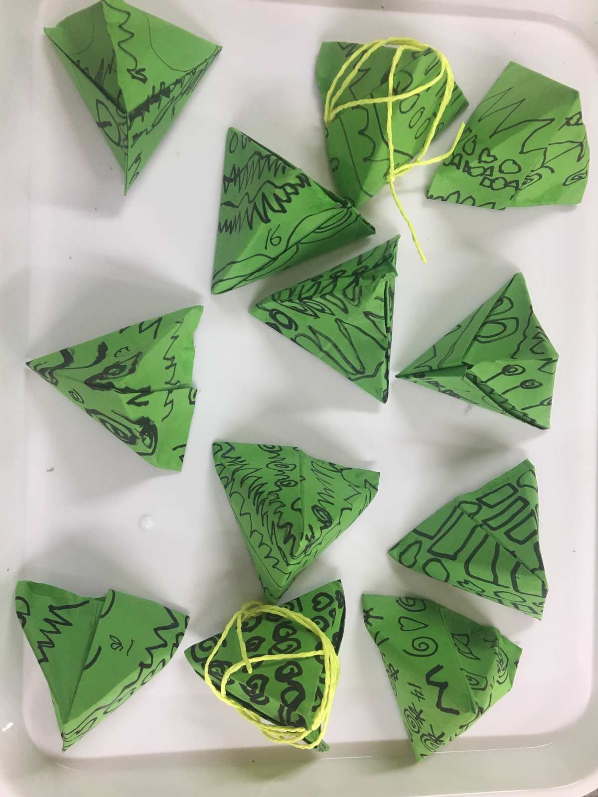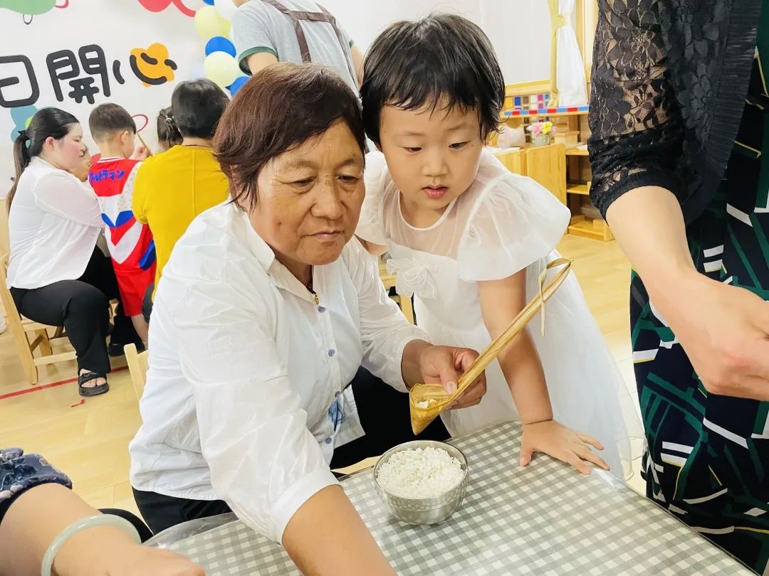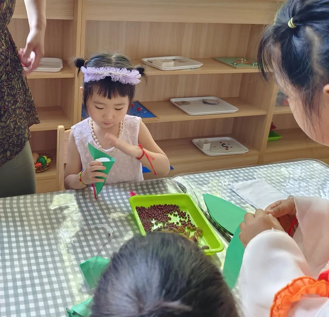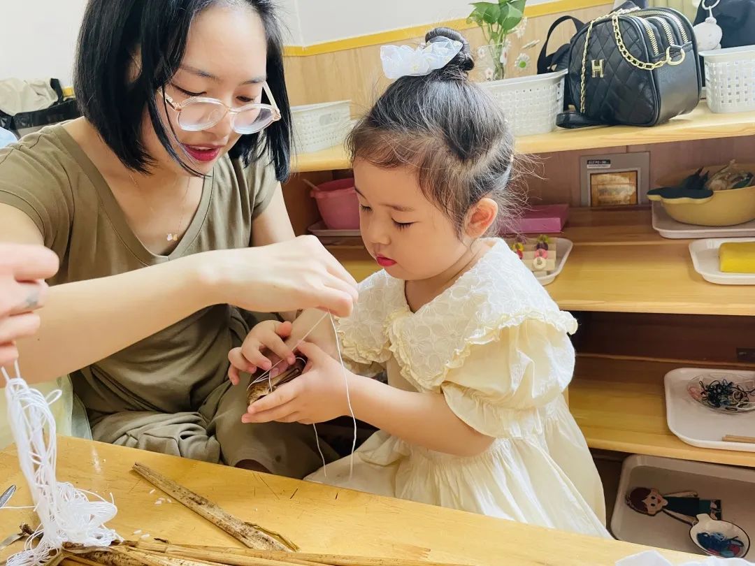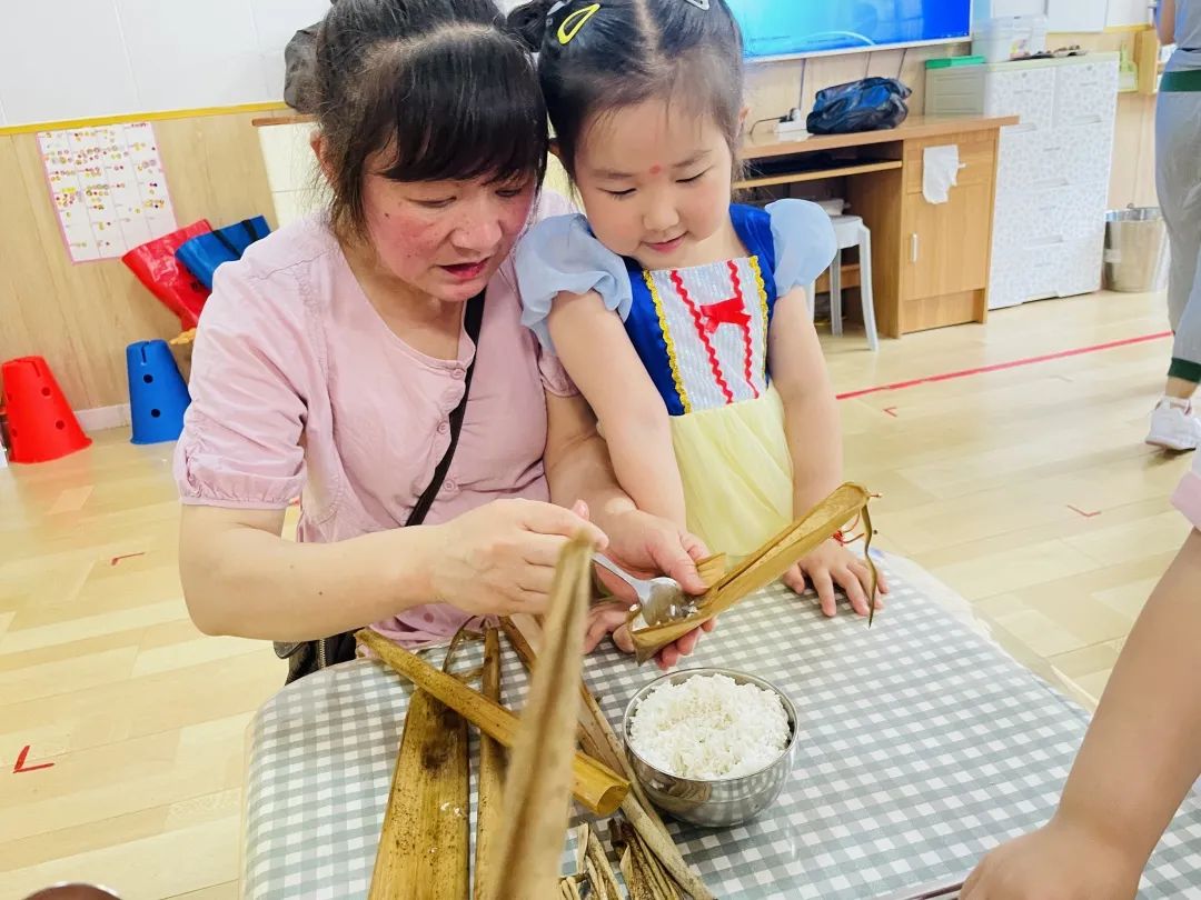 :家长朋友们和小朋友们一起动手,看,他们折粽叶、填糯米、裹粽叶、扎绳子......家长朋友们和孩子们热情专注地包着属于自己的、独一无二的粽子!