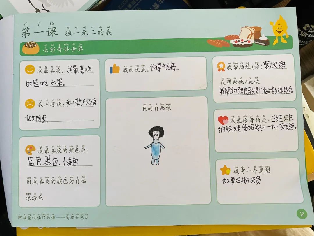 有一个小女孩在她的工作纸上“我最珍贵的是”这一空格里写道:已经去世的姥姥留给我的一个小项链。当看到这个工作纸时,我突然觉得课堂变得更有意义了。除了在课堂上,孩子们还能在自己的学生手册上勾勒未来,表达自己的情绪。