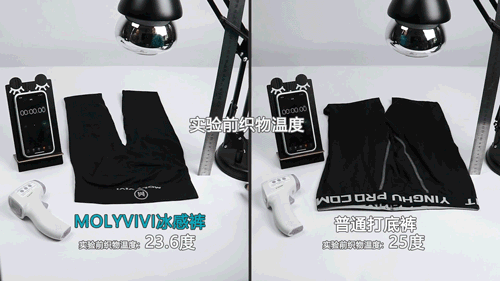将魔力裤和其他裤子放在在100度的卤素灯照射下,MolyVivi的紧身裤具有良好的防升温效果。