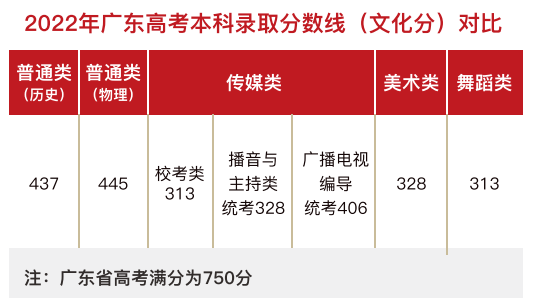 例如,在2022年广东高考中,舞蹈类艺考生仅需达到313分即可考入本科,而传媒(播音与主持类)和美术艺考生的本科文化分数线为328分,低于普通类(历史)437分和物理445分的分数线。