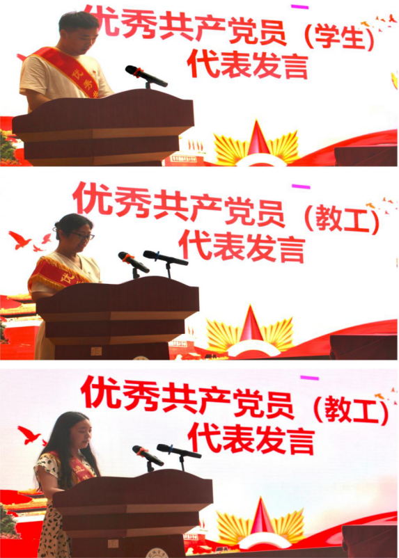 优秀学生党员代表林斗龙,来自建筑与艺术学院2021级环境设计专业(专升本),土木工程学院教师王静同志,机电学院学生第二党支部书记胡成凤同志也分别发言。她们总结了一年来在思想、学习和工作上的进步,分享了个人和集体取得的成绩和经验。她们表示不会辜负党组织的殷切希望,珍惜荣誉,谦虚谨慎,再接再厉,发挥党员先锋模范作用,在平凡的岗位上作出新的贡献。