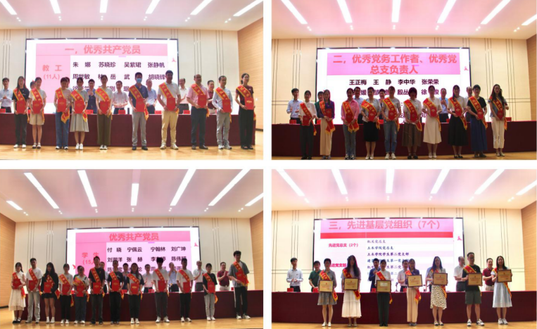林瀚宣读《关于表彰2023年度优秀共产党员、优秀党务工作者、优秀党总支负责人、先进基层党组织的决定》,校领导为获奖者颁发证书并合影。
