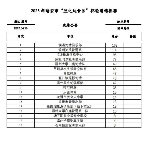 2023年4月16日,瑞安市举办了一场盛大的“胶之炖食品”杯轮滑锦标赛。比赛由市体育事业发展中心主办,市轮滑协会承办,在瑞立外滩生活广场举行。共有来自温州周边县(市、区)的300余名运动员参赛,其中年龄最小的只有6岁,最大的已经成年。