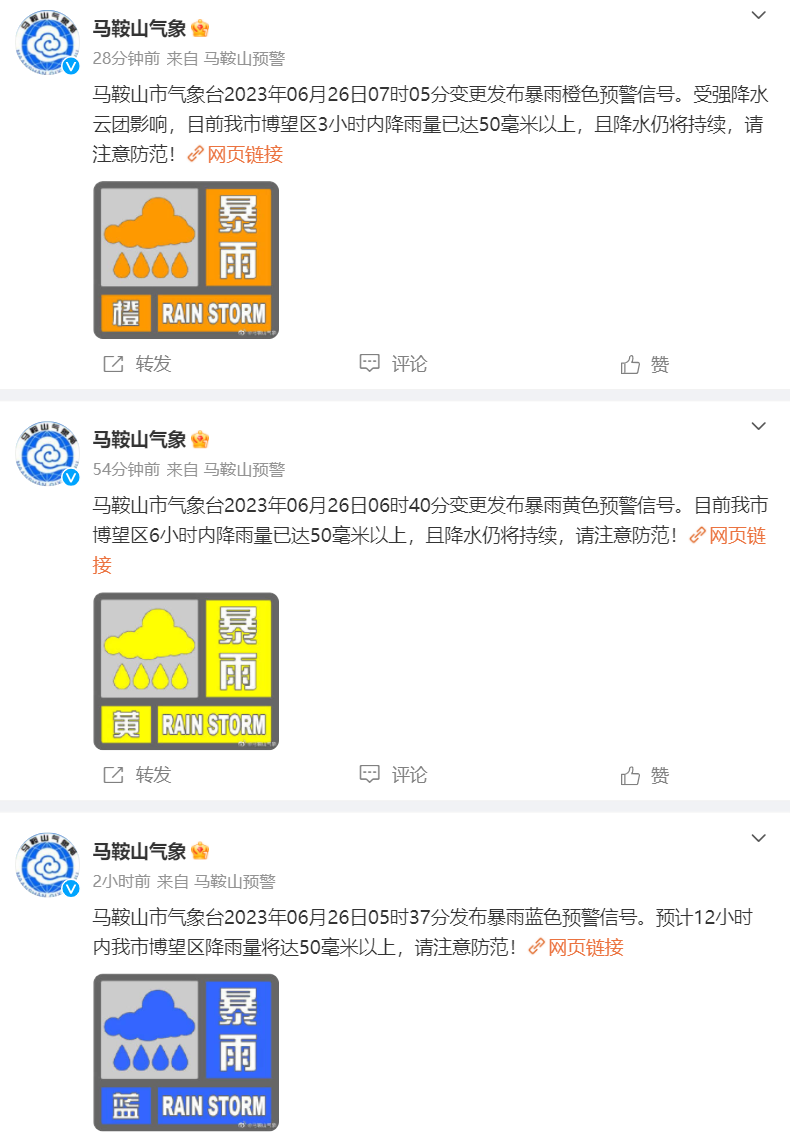 马鞍山市气象台于2023年06月26日07时05分变更发布了暴雨橙色预警信号。由于受到强降水云团的影响,目前我市博望区3小时内降雨量已超过50毫米,且预计仍将持续。请注意防范!