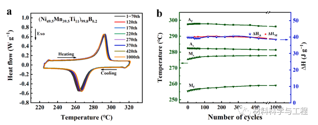图6.相变和热物理性质的热循环稳定性。(a)(Ni49.5Mn39.5Ti11)99.8B0.2SS-PCM在第1-70、120、170、220、270、370、420和1000次热循环期间的DSC曲线。(b)相应相变温度(Ms、Mf、As和Af)和相变焓变(ΔHM、ΔHA)作为循环次数的函数。