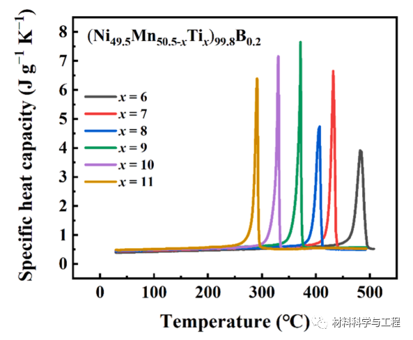图3.(Ni49.5Mn50.5-xTix)99.8B0.2SS-PCM的比热容与温度的关系。