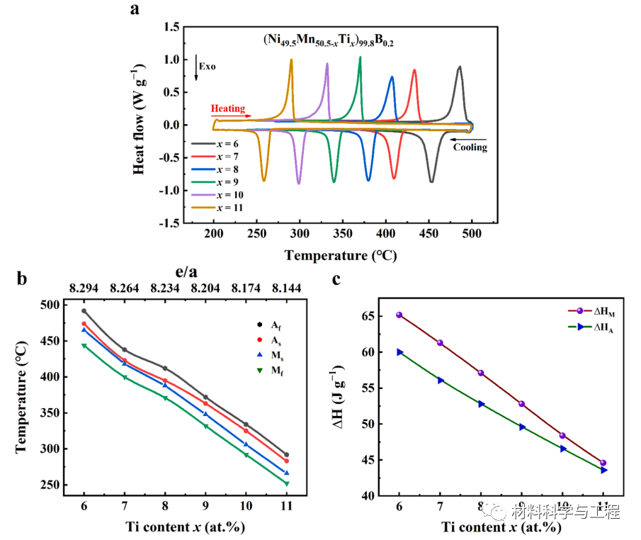 图1.Ni49.5Mn50.5-xTix)99.8B0.2SS-PCM量热结果。(a)DSC曲线;(b)正向(Ms和Mf)和反向(As和Af)相变温度与Ti 含量x和价电子浓度e/a的函数关系;(c)与正向(ΔHM)和反向(ΔHA)相变相关的焓变与Ti 含量x的函数关系。
