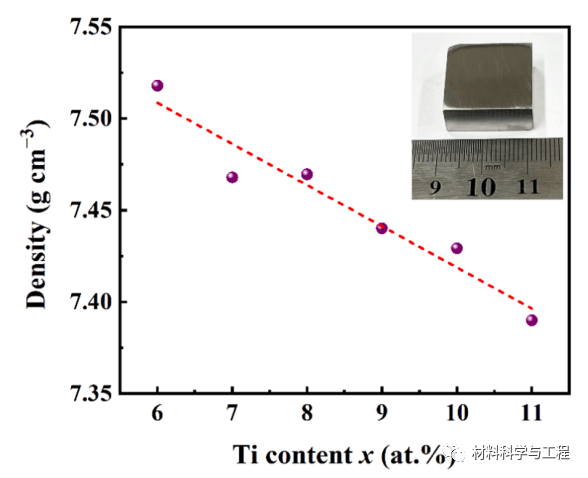 图2.(Ni49.5Mn50.5-xTix)99.8B0.2SS-PCM的密度与Ti含量 x的函数关系。红色虚线为用符号表示的实验数据的线性拟合。