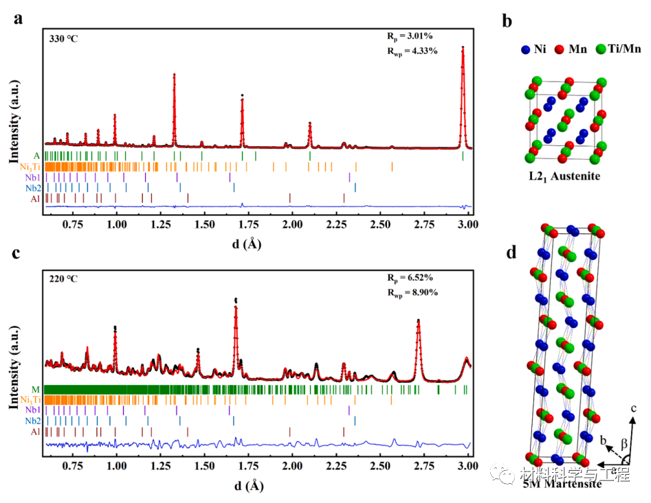 编辑:图8.中子粉末衍射结果。(a)(Ni49.5Mn39.5Ti11)99.8B0.2SS-PCM在330°C下观察到的中子粉末衍射图(黑点)和差分图(红线)。(b)高温奥氏体相晶体结构示意图。(c)(Ni49.5Mn39.5Ti11)99.8B0.2SS-PCM在220°C下观察到的中子粉末衍射图(黑点)和差分图(红线)。(d)低温马氏体相晶体结构示意图。对于涉及的相,“A”和“M”分别表示高温奥氏体和低温马氏体。