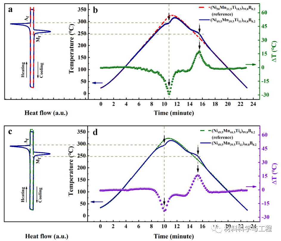 :图7.瞬态温度响应结果。(a)(Ni49.5Mn39.5Ti11)99.8B0.2(实线)和(Ni50Mn31.5Ti18.5)99.8B0.2(虚线)SS-PCMDSC曲线。(b)ΔT(Ni49.5Mn39.5Ti11)99.8B0.2和(Ni49.5Mn44.5Ti6)99.8B0.2与(Ni49.5Mn39.5Ti11)99.8B0.2和(Ni49.5Mn44.5Ti6)99.8B0.2的ΔT比较。(c)(Ni49.5Mn39.5Ti11)99.8B0.2(实线)和(Ni49.5Mn44.5Ti6)99.8B0.2(虚线)DSC曲线。(d)ΔT(Ni49.5Mn39.5Ti11)99.8B0.2和(Ni49.5Mn44.5Ti6)99.8B0.2与(Ni49.5Mn39.5Ti11)99.8B0.2和(Ni49.5Mn44.5Ti6)99.8B0.2的ΔT比较。
