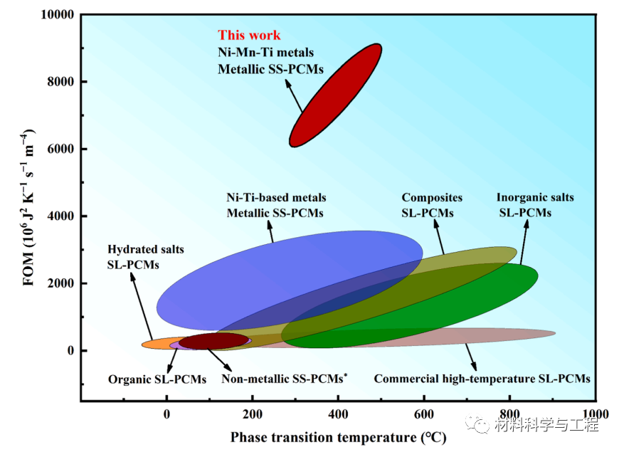 图5.典型SS-PCM和SL-PCM的相变温度下品质因数(FOM)的绘制。数据来自现有工作和文献。*非金属SS-PCM包括有机多元醇SS-PCM、有机金属SS-PCM和聚合物SS-PCM。