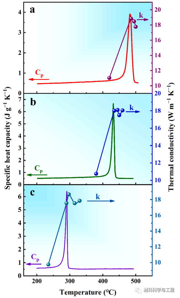 图4.热导率(k)和比热容(Cp)。(a-c)热导率(k)和比热容(Cp)对不同Ni-basedSS-PCM加热温度依赖性的测试。(a)加热温度为1000度时(Ni49.5Mn44.5Ti6)99.8B0.2(a)、(Ni49.5Mn43.5Ti7)99.8B0.2(b) 和(Ni49.5Mn39.5Ti11)99.8B0.2(c) 的SEM图像。