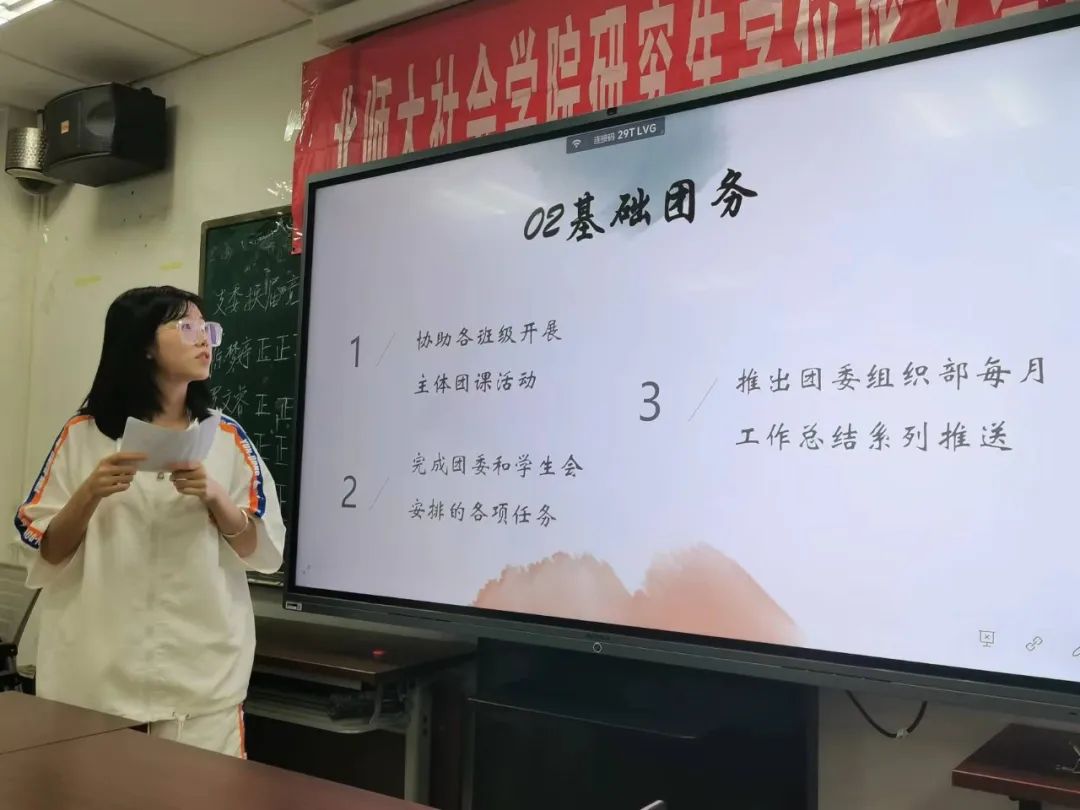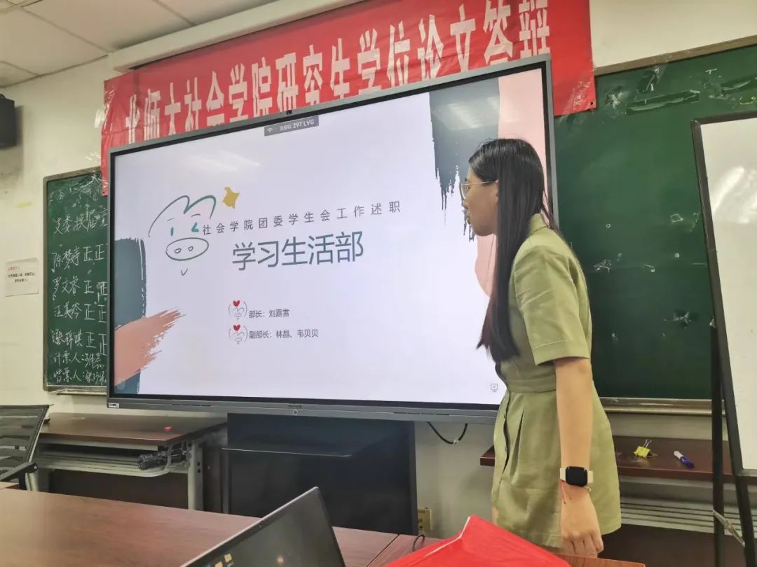 组织部部长吴丹红同学从工作介绍、不足之处和总结展望三部分进行了述职。她表示,组织部依托“初级团校”特色活动平台,在延续原有品牌活动的基础上推陈出新,在过去一年中取得了令人满意的成绩。在2022年9月至2023年7月期间,组织部总共开展了5次“初级团校”主题活动。在初级团校开营期间,组织部开展了丰富多彩、形式多样的活动,如经验分享类活动。同时,组织部还重启了“优秀学员”评选活动,并圆满结营。 吴丹红同学表示,在工作中,部员们彼此相处融洽,分工明确、配合默契,高效高质地完成了各项任务。此外,“社会学院团委组织部每月工作总结”系列推送也得以稳步推出。 然而,在过去一年中,组织部也存在一些不足。首先,本学期初级团校缺乏培训类和素质拓展类活动,未能发挥初级团校培训方面的优势。其次,本学期初级团校与校青年团校秘书处的链接薄弱。最后,本学期初级团校活动仍较为程序化,与学员们学习生活联系较弱。 针对以上工作总结,吴丹红同学希望下一届组织部能够扬长避短,不断推陈出新。她祝愿新一届的小伙伴们在今后这一年取得优异成绩,并祝愿社会学院团委学生会越来越好!