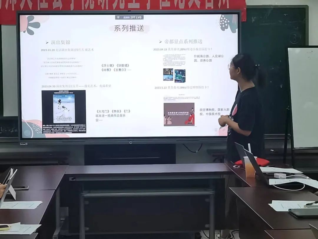 实践部部长刘春霞同学将过去一年的工作总结分为实践活动和系列推动两个板块。她详细阐述了各个活动的开展情况,包括实践活动方面,“辅仁之行”在延续旧有品牌活动的基础上进行了创新。她邀请了北京师范大学白鸽青年志愿者协会的志愿者来进行讲解,提升了专业度。此外,“健身打卡营”创新了活动期限,以21天为期进行举办,反响热烈。“景点打卡活动”为参与者制作了打卡图,并在规则上分为占领积分和一般积分两种,新意十足。在系列推送方面,实践部依托演出集锦和帝都景点系列推送,基本保持一月一期或两期的更新频率。最后,刘春霞同学认为,上一学年实践部的工作主要继承传统与开拓创新,在部分活动开展中仍存在问题,希望未来实践部能够改进并不断提升活动品质。