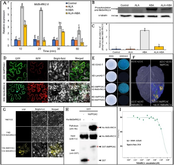 图3.ALA抑制ABA诱导的MdSnRK2.6表达及其蛋白磷酸化,且MdSnRK2.6与MdPP2AC存在蛋白互作关系