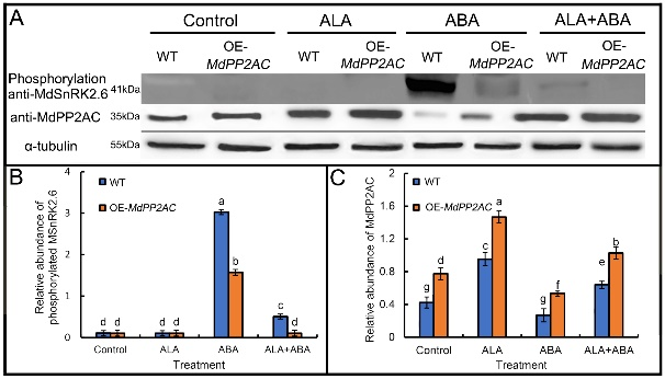 图4.ALA和ABA处理对过表达MdPP2AC基因苹果叶片SnRK2.6磷酸化水平与MdPP2AC蛋白丰度的影响