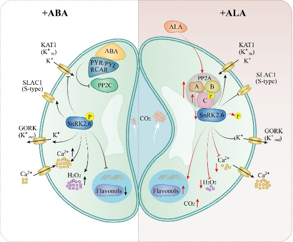 5-氨基乙酰丙酸(ALA)是一种天然的δ-氨基酸,它是所有卟啉化合物(如叶绿素和血红素等)的生物合成关键前体。已经证明,ALA能够缓解逆境胁迫并增强植物在逆境下的光合固碳能力,从而提高作物产量和改善产品品质。然而,关于ALA如何逆转ABA诱导的气孔关闭的机理仍然未知。