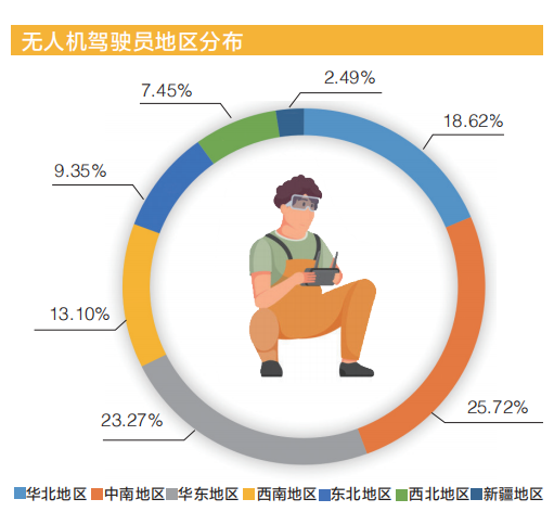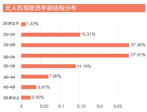 2022年,辽宁省抚顺市第一中等职业技术专业学校教师金宏光在辽宁省第一届职业技能大赛无人机赛项中荣获冠军。当时,金宏光先生已经40岁,作为一名无人机行业“高龄”驾驶员,他在这个领域取得了巨大的成就。 “我的学生现在都在15岁左右,他们中专毕业后还要考大专院校,到18岁才能正式考证。作为一个新兴职业,无人机驾驶员偏向年轻化。截至2018年,无人机驾驶员中20岁以下的从业者约占1%,40岁以上的从业者占比约14%;大部分从业人员的年龄为20—40岁,其中25—35岁的从业者占比超过50%。 在收入方面,无人机驾驶也显示出新兴行业的优势。大部分无人机驾驶员的收入为当地平均水平的1-2倍。约68%的无人机驾驶员收入持平或高于当地平均收入水平,收入水平达到或高于当地平均收入水平2倍以上的占13%。极少数无人机驾驶员的收入可达到当地平均水平的3倍以上。