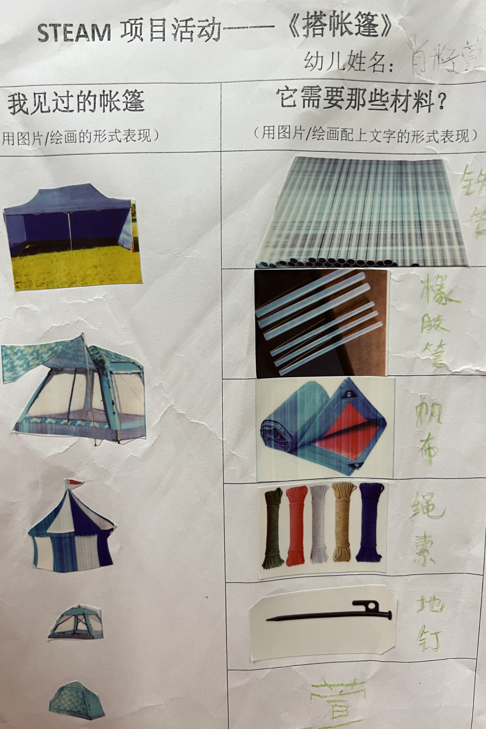 通过调查,孩子们发现一个帐篷的基本组成部分包括:1.支撑杆(支撑整个帐篷)。