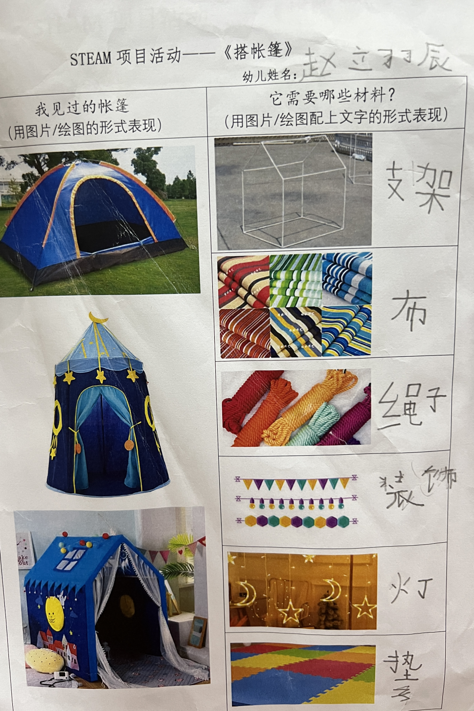 (1)孩子们能够根据自己的计划,逐步完成帐篷的制作。