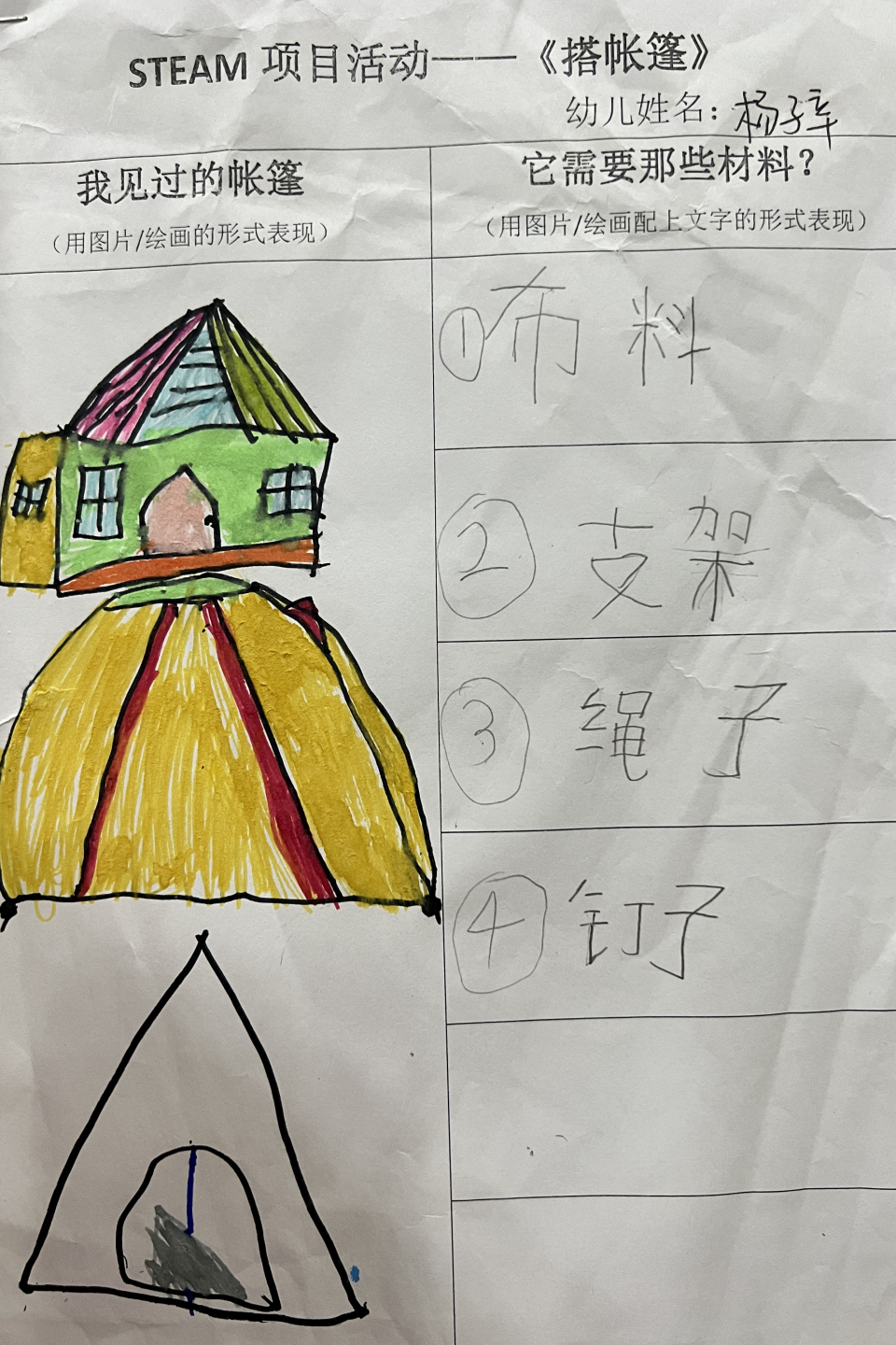 2.在对帐篷进行调查、设计和搭建的过程中,我们可以通过绘画的形式来记录我们的成果,并进行讨论和改进。