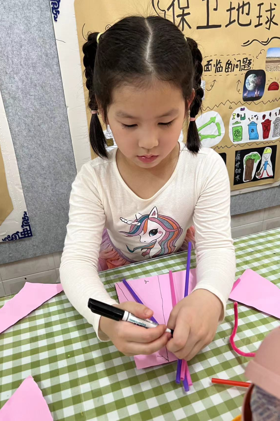 粗吸管、细吸管、冰棍棒、废旧筷子等等,都是他们的小支架材料。不过,孩子们觉得材料还是太少,于是班级里的废旧报纸也被拿来卷成纸棒,作为他们的材料之一。