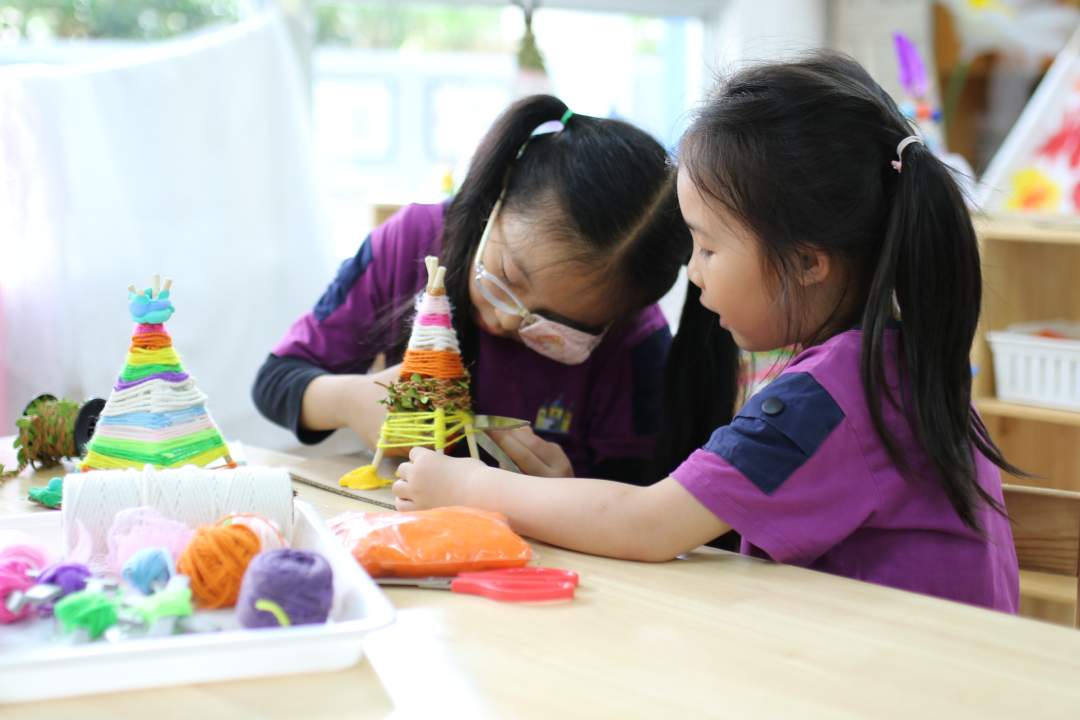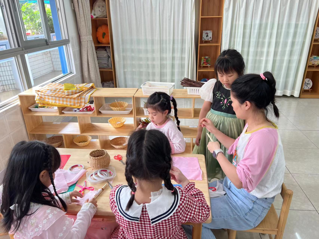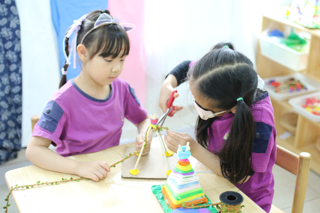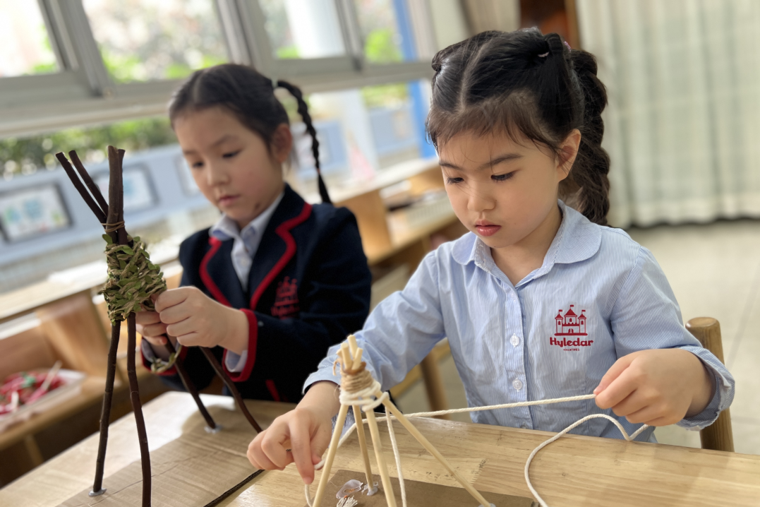 在孩子们第一次尝试制作时,他们遇到了一个问题:如何绑住绳子。由于无法自行解决这个问题,他们无法继续下一步的制作。因此,老师介入并向幼儿介绍了捆绑固定的方法。