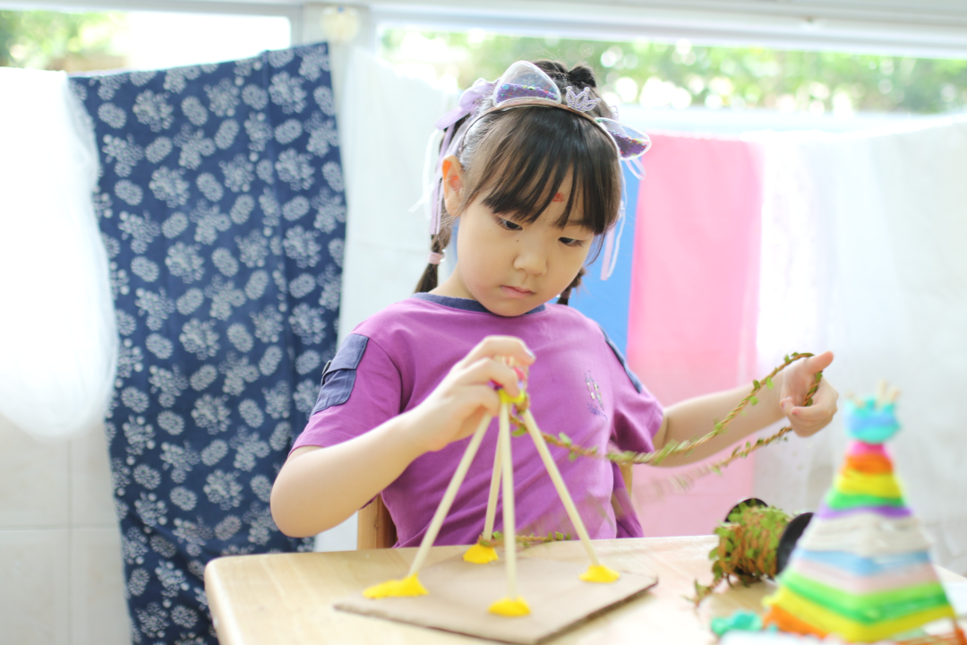 七七说:“我要把这几根树枝绑在一起,可是我不会绑。”她用一只手扶住树枝,另一只手拿着线,试图固定它。“老师,我不会,你能帮助我一下吗?”