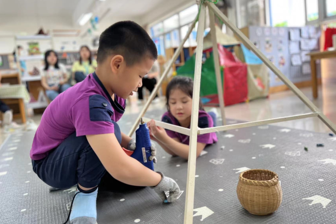 “制作帐篷”涉及多个领域的问题,包括支架原理、模型与实物比例探索、力学辅助和风力等。学前阶段的幼儿主要通过直接感知、动手操作和亲身体验来学习。本项目充分尊重幼儿的思维发展特点,以“制作帐篷”作为主线,通过认识帐篷、设计帐篷、制作帐篷和使用帐篷来解决问题,构建经验。在认知帐篷的过程中,幼儿了解了帐篷的结构和类型;在设计帐篷的过程中,发展了绘图能力,促进了幼儿对空间设计和物体图画表征能力的提升;在制作帐篷过程中,解决了支架构建、粘合安装和比例探索等工程、技术和科学问题,并发挥了合作能力,构建了学习共同体;在使用帐篷的过程中,体验了成果,完善了对帐篷的认识,促进了幼儿的发展。经过1个多月的探索,幼儿成功制作了帐篷,构建了关于帐篷制作的完整经验。结合班级环境创设和幼儿活动,发挥了帐篷的实用价值,并享受了项目成果带来的体验。