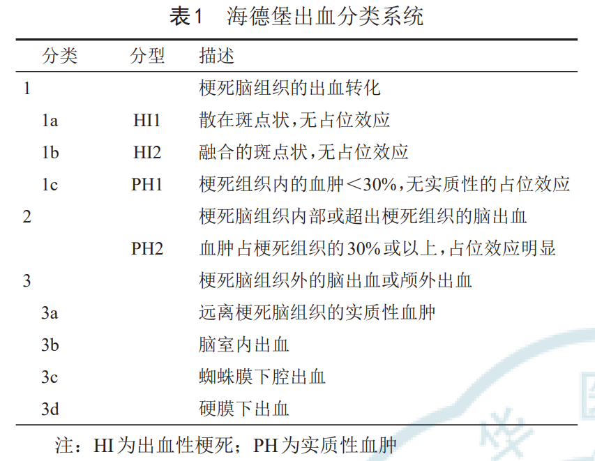 辑:这种分类方法存在一定的局限性,对梗死区域内和远离梗死区域外的实质性血肿的分类并不明确。此外,缺少对蛛网膜下腔出血、脑室内出血的分类标准。近年来,提出了一个更广泛的影像学分类系统——海德堡出血分类系统(表1)。