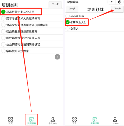首先,进入小程序,然后点击“我要报名”,接着选择“药品经营企业从业人员”,最后点击“GSP”。