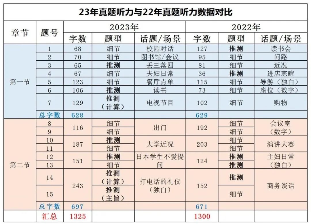 根据这些数据,我们可以看出,23年真题的听力难度总体上比22年有所上升。这主要体现在三个方面:语速加快、独白题的话题选题难度增加以及篇幅翻倍(第二节最后一段录音)、推测题的比例上升。