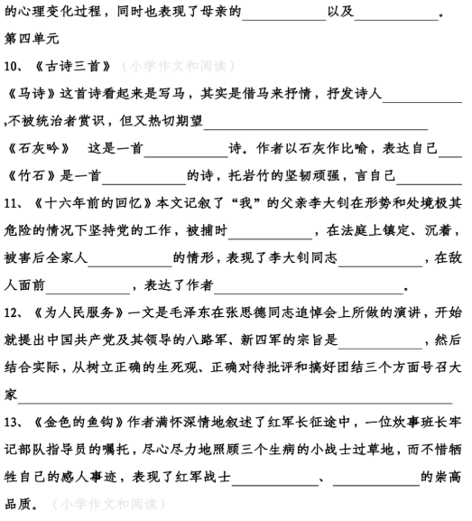 11、《十六年前的回忆》这篇文章讲述了“我”的父亲李大钊在形势和处境极其危险的情况下,仍然坚持党的工作。当他被捕时,他表现出色,在法庭上镇定、沉着。在他被害后,全家人都感到极度悲痛。这表现了李大钊同志忠于革命事业,在敌人面前坚贞不屈的精神。同时,也表达了作者对父亲的怀念之情。