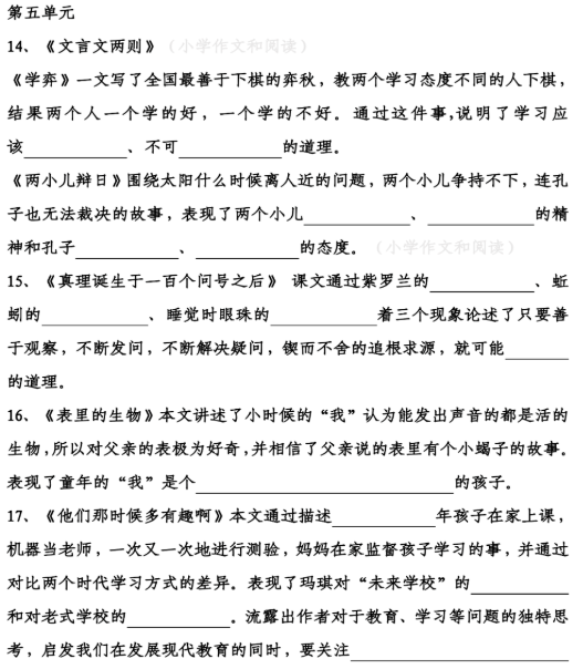 16、《表里的生物》本文讲述了小时候的“我”,他认为能发出声音的都是活的生物。因此,他对父亲的表极为好奇,并相信了父亲说的表里有个小蝎子的故事。这表现了童年的“我”天真无邪,善于观察和思考,对事物有着强烈的好奇心和旺盛的求知欲。