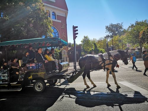 游客乘坐马车在天津市民园广场观光。
