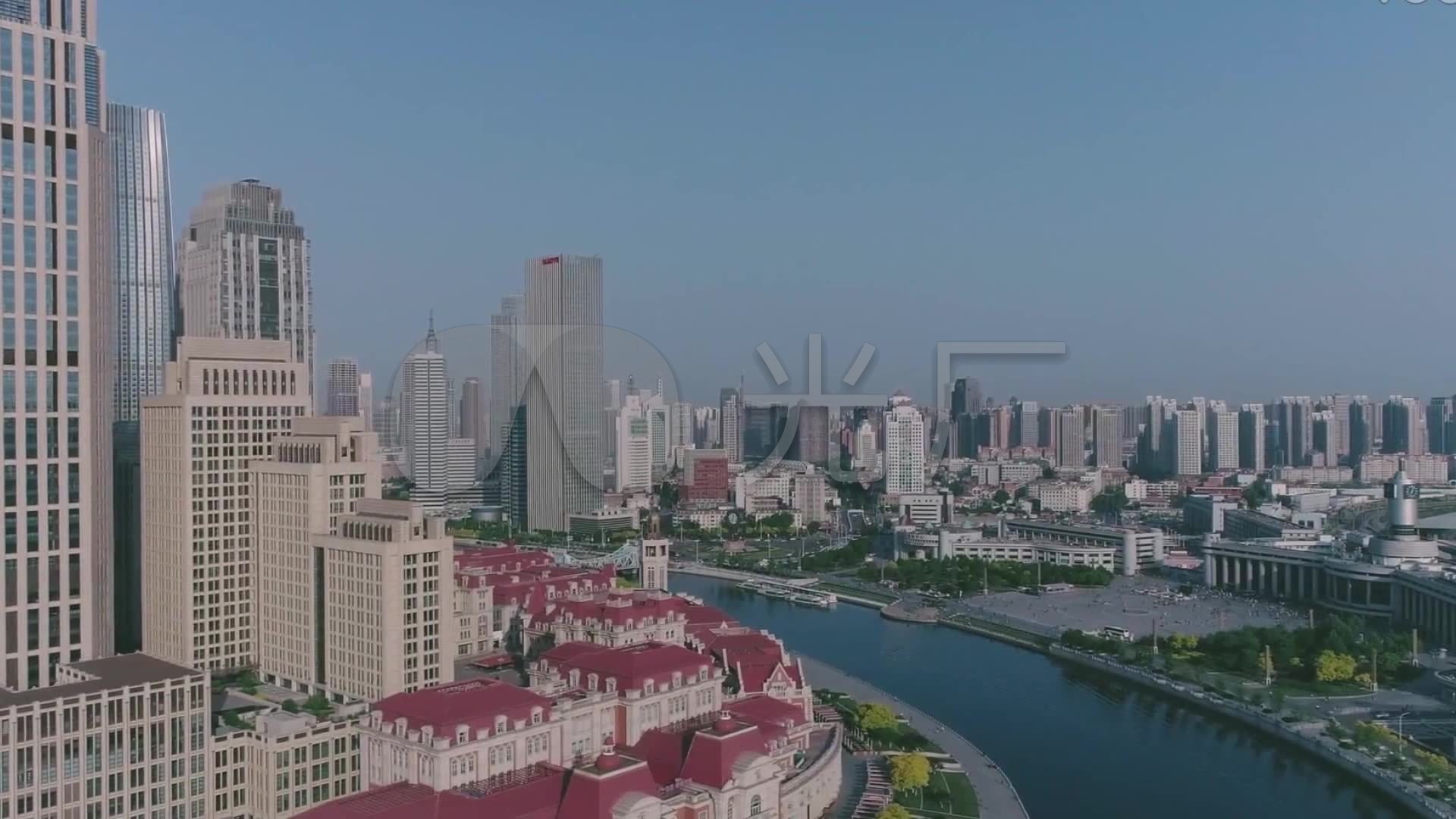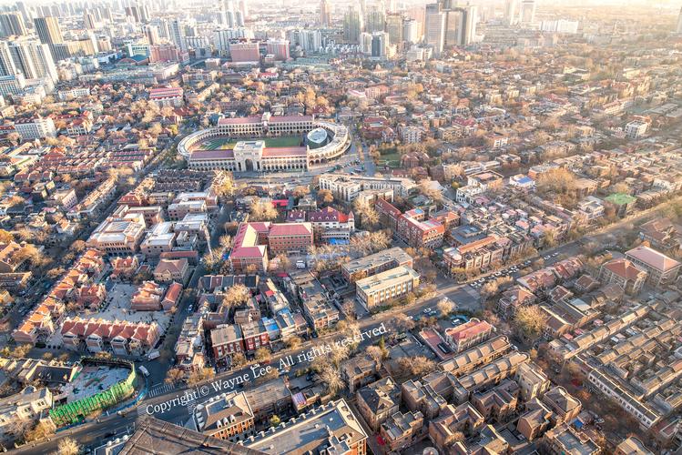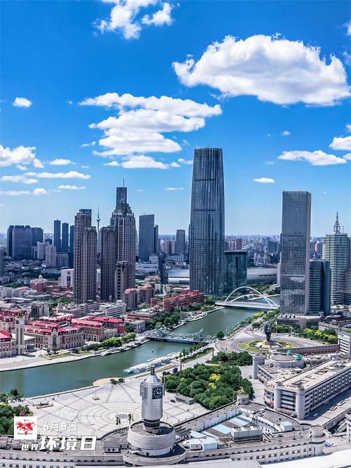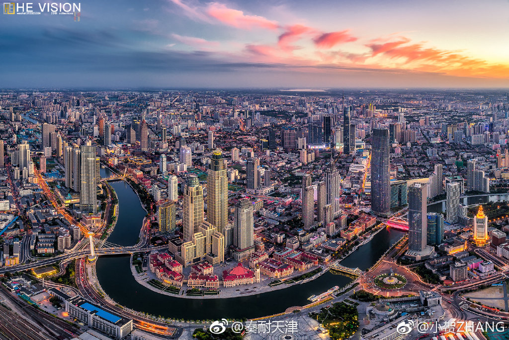 的照片,它展示了天津市中心城区的壮丽景色,从高空俯瞰,令人震撼。