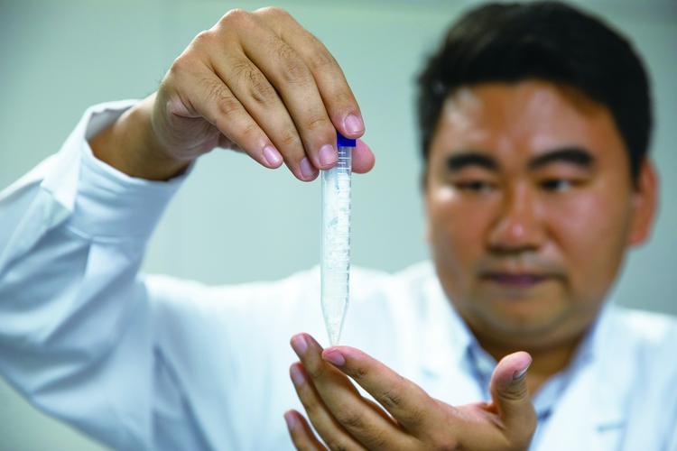 中国科学院天津工业生物技术研究所科研人员在实验室展示人工合成淀粉样品