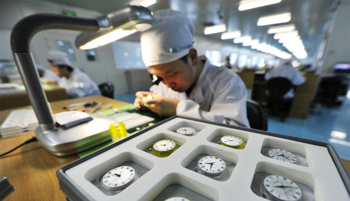 在天津海鸥表业集团的生产车间里,工人们正在操作台前忙碌地组装手表。
