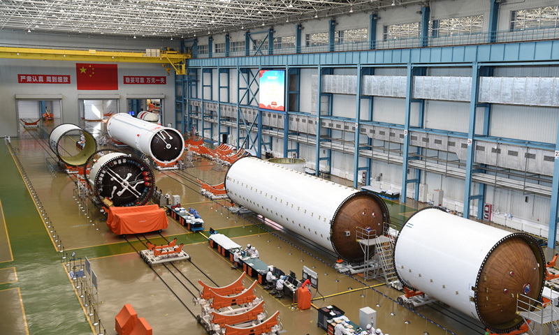 在中国航天科技集团一院天津大运载基地,长征五号运载火箭总装车间巍然矗立。