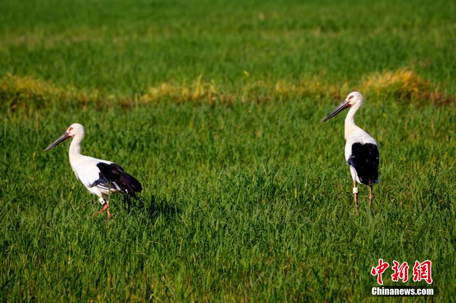 两只东方白鹳在水面上翩翩起舞。