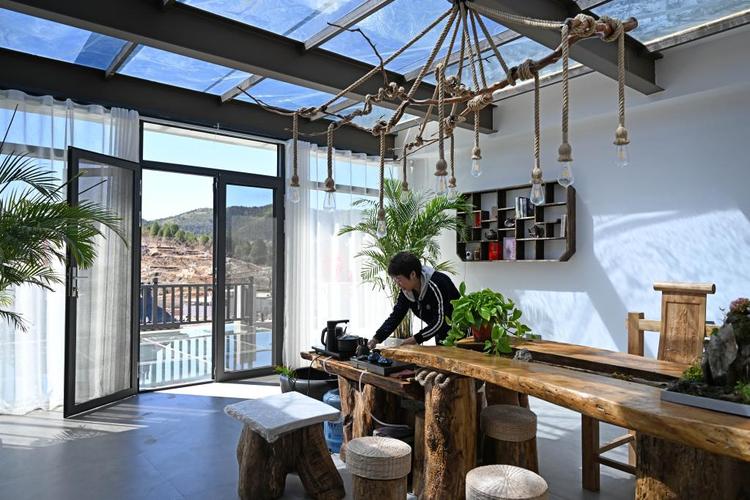 天津市蓟州区罗庄子镇二十里铺村的一位民宿负责人正在整理茶具。