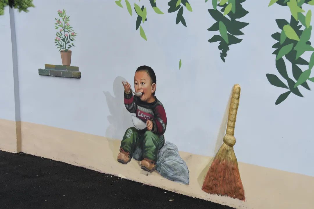 在荣县交通运输局的办公区域旁边,有一个工行小区。最近,小区的地面被黑化,非常平整。院坝的正中央和左右两侧都挖出了绿化树窝子,等待栽树。左侧围墙上还绘制了近10幅传承文明的图画。