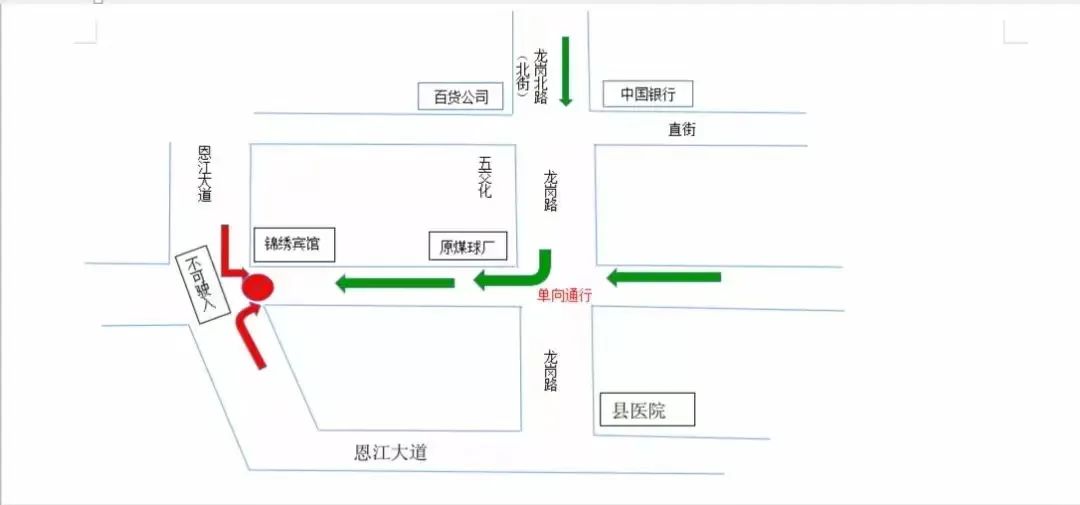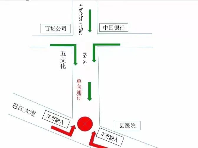 龙岗南路与恩江南路口实行单向限行,车辆只能从直街五交化路口进入,禁止从恩江南路(县医院路段)驶入龙岗南路。