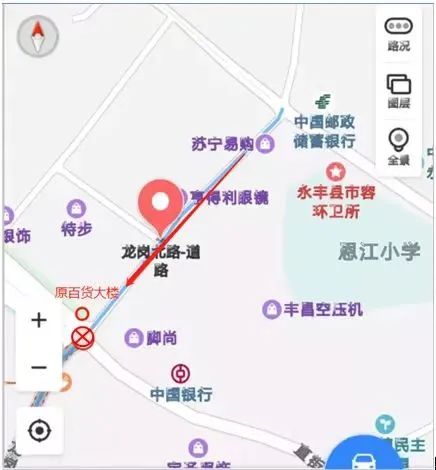 龙岗北路为单向行驶路段,车辆只能从北向南进入龙岗北路,而不能从五交化路口(原百货大楼)驶入。