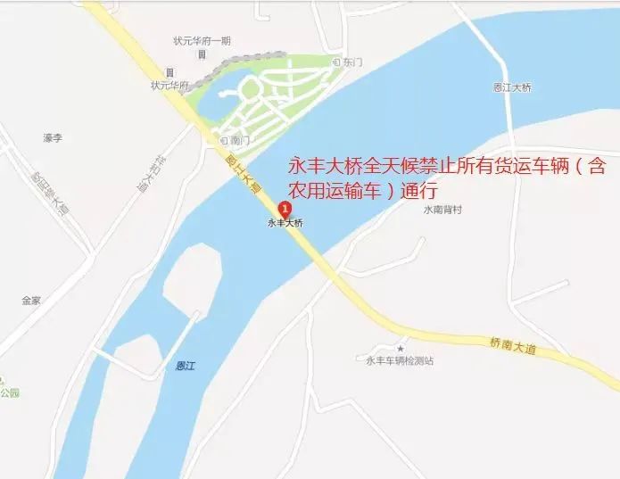 永丰大桥禁止所有货运车辆(包括农用运输车)通行。需要通过永丰大桥进出县城区的货运车辆(包括农用运输车),请绕行迎宾大桥(原永丰三桥)或绕环城公路。