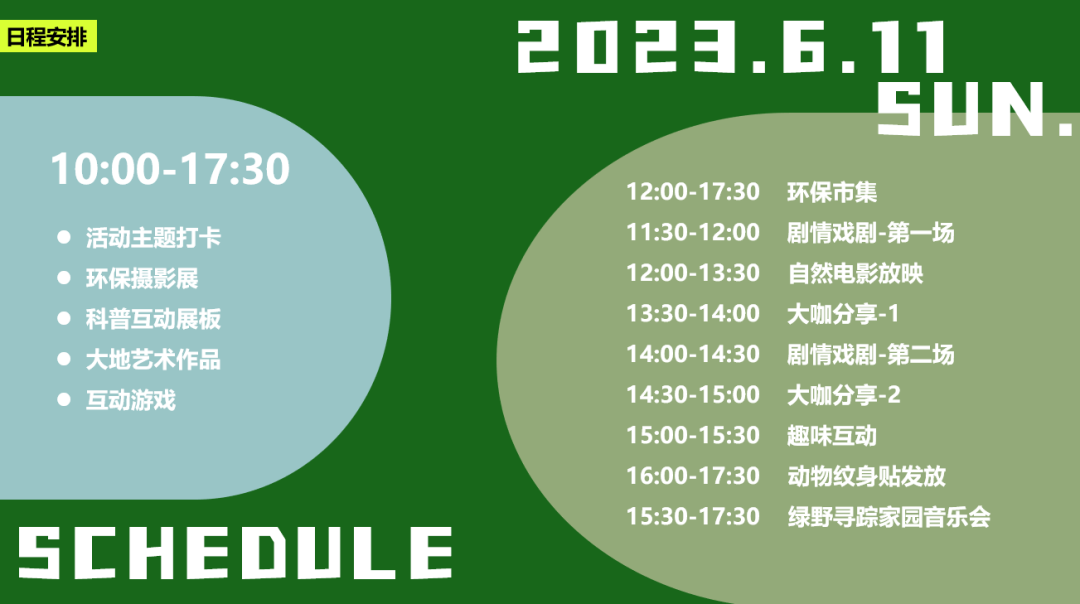 生态保护主题展览、参与式自然戏剧、大地艺术装置、生态保护大咖演讲、自然潮玩市集、自然互动手工坊、森林音乐会,七大板块,让你玩不停!