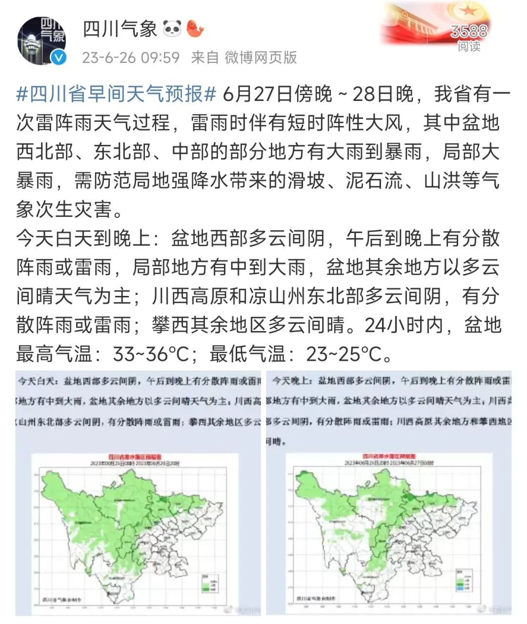 根据四川气象的天气预报,6月27日傍晚至28日晚,我省将迎来一次雷阵雨天气过程。雷雨过程中,短时阵性大风将伴随而来。其中,盆地西北部、东北部和中部部分地区将会有大雨到暴雨,局部地区甚至会出现大暴雨。为防范局地强降水带来的滑坡、泥石流、山洪等气象次生灾害,需加强防范。
