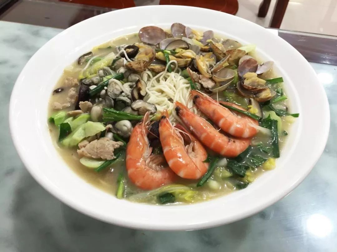 午餐:鸡蛋和海鲜一起煮的卤面。