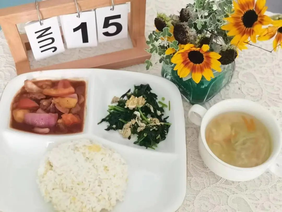 午餐时,我们品尝了土豆牛肉煲番茄和蛋香菠菜。